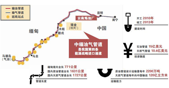 中缅油气管道的石油线起点位于皎漂经济特区的马德岛,天然气起点在马德岛的下方某地。计划的中缅铁路终点就位于皎漂经济特区。就在上个月11日,中缅原油管道工程宣告正式投入运行。