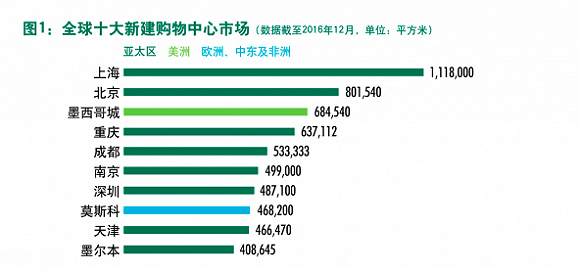 中国城市在全球十大在建购物中心面积排名中占据八席。其中上海是新增购物中心最多的城市,北京、重庆、成都、南京、深圳和天津依次进入了前十。