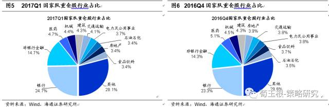 一季度国家队主要增持了非银、银行等大金融行业,较16Q4分别上升1.4、0.4个百分点,增持个股如中信证券(16.5亿)、民生银行(15.7亿)等,主要减持了医药、汽车、家电等大消费行业,较16Q4分别下降0.4、0.3、0.3个百分点,减持个股如万科(-54.8亿)、格力电器(-43.8亿)等。由此可见,国家队在一季度主要卖出了获利较多的消费类个股,而为了稳定市场增持了权重较大的金融股。