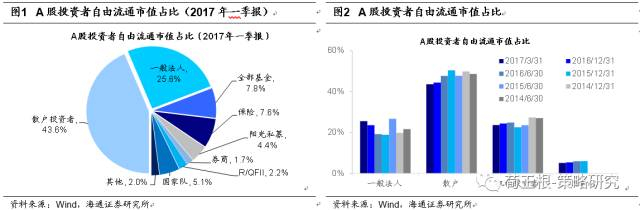 此外,17Q1A股投资者流通市值占比中,散户投资者占24.6%,一般法人58%、公募基金4.4%、保险和社保4.3%、阳光私募2.5%、券商1.0%、QFII和RQFII1.3%、国家队2.9%。