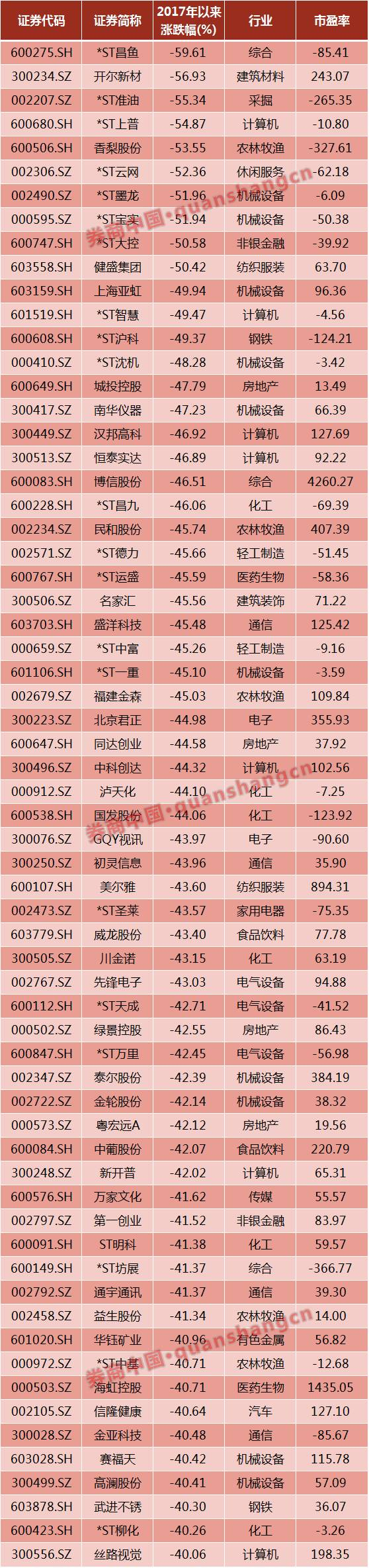 虽然进入2017年以来,沪指只跌了1.64%,但是如果将个股跌幅的统计区间放大至2017年年初至今,个股的跌幅更为吓人。腰斩个股数量多达10只。