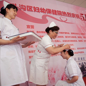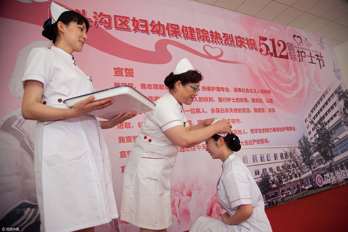 2017年5月10日,北京门头沟区各医院相继举办了庆祝“5.12国际护士节”主题大会。图为护士长在为新护士戴护士帽。