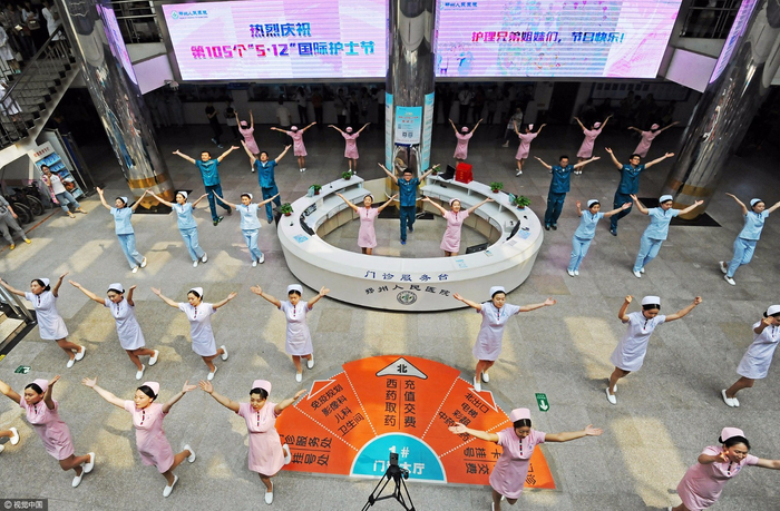 河南省郑州市,郑州人民医院50多名护士身着护士服,伴随着《青春修练手册》的旋律,在该院门诊大厅跳起了青春活力的舞蹈,共同庆祝即将到来的护士节。前来就诊的患者和家属纷纷驻足观看。