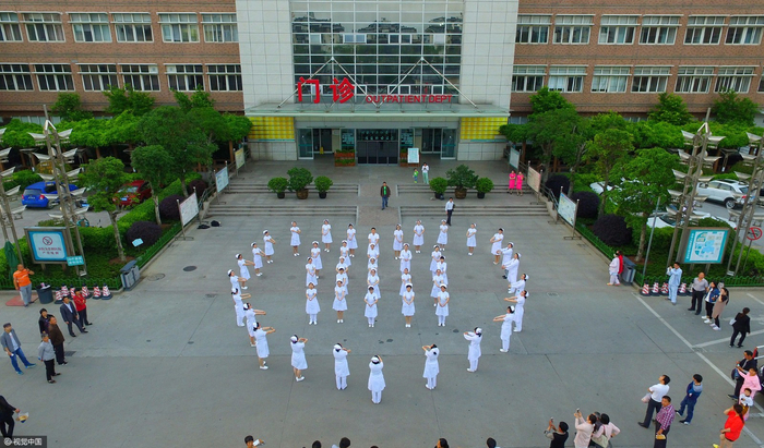 江苏扬州,60名青春活力的“白衣天使”在医院的广场上演集体“快闪”,拼出“5·12”字样和“爱心”图案,通过这样一种方式迎接即将到来的5·12”国际护士节。