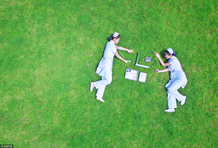 西安市中医医院的护士在草坪上拍照,从上帝视角看我们的白衣天使们。