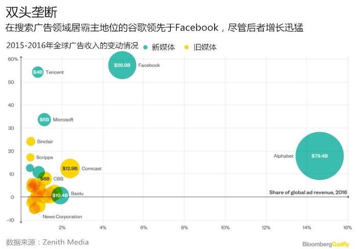 Zenith表示,2016年,这两家公司合计占据了支出总额5430亿美元广告市场的五分之一,远高于2012年时的11%。就像Gadfly专栏作者Shira Ovide所形容的那样,它们简直就是双头垄断。