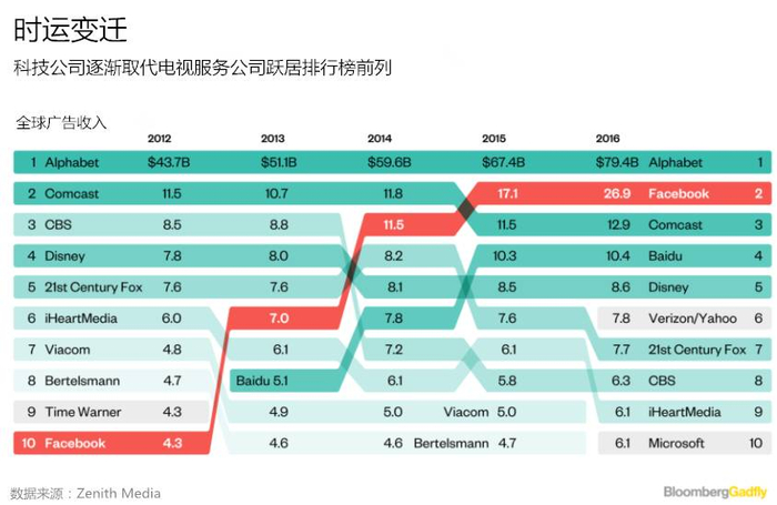 科技公司正以飞快的速度取代电视服务公司。2013年的时候,排行榜前10位里仅有谷歌和Facebook。到了2016年,前10位里面有5家科技公司:Verizon Communications Inc.携收购雅虎(尚未完成)之威加入进来,还有百度和微软。而且主要广告载体从旧媒体向新媒体的转变仍然没有结束。2017年,在线广告支出将首次超越电视广告支出。