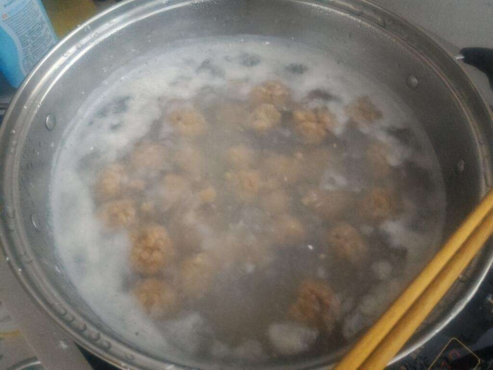 6、煮肉丸子:浮起来后等5分钟丸子扔锅里煮沸浮起来,就熟了吗?检测刚浮起来的丸子温度,显示肉丸中心温度为45.4℃;重新将肉丸放入滚锅中加热,5分钟时捞出再测,中心温度达到了72.3℃。