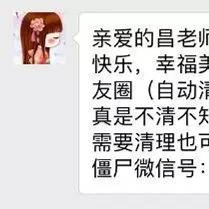 “亲爱的xxx你好,祝你情人节快乐,幸福美满!顺便清理下朋友圈(自动清理),效果不错。真是不清不知道,一清吓一跳。需要清理也可以加她微信(清理僵尸微信号: ****)”
