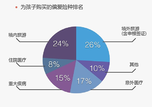 报告显示,在为小孩买保险的同时,超过65%的母亲选择为自己投保,其次才是丈夫(32.9%)和父母(16.5%)。妈妈们在为孩子购买保险的偏好上,除了旅游险的消费,排名占比靠前的依次为意外医疗险、重疾险和住院医疗保险。