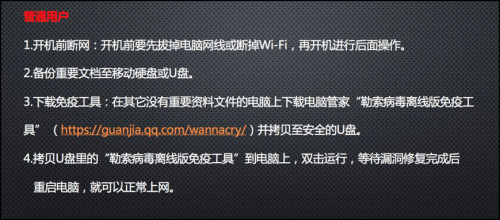 对此,腾讯安全反病毒实验室负责人、腾讯电脑管家安全专家马劲松表示,WannaCry勒索病毒虽然潜在危害大,但安全研究人员在防御WannaCry勒索病毒方面已经取得一些进展。此前腾讯电脑管家已经发布“勒索病毒免疫工具”及“勒索病毒免疫工具离线版”,用户只要掌握正确处置方法,通过电脑管家勒索病毒免疫工具,就可以加固电脑以免被感染。