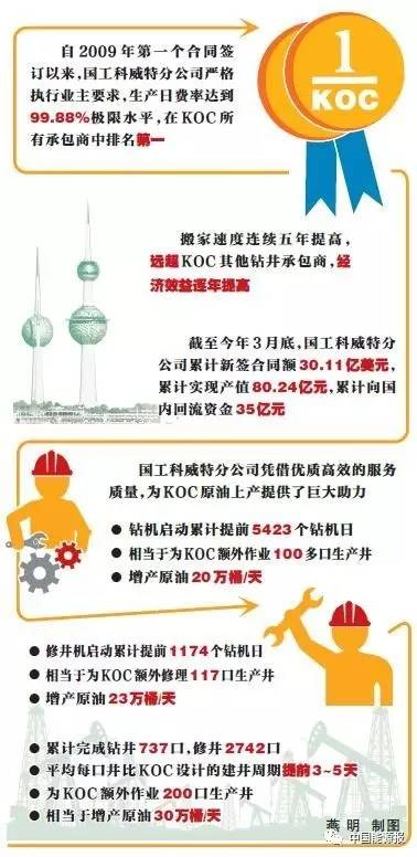 自2009年第一个合同签订以来,国工科威特分公司严格执行业主要求,生产日费率达到99.88%极限水平,在KOC所有承包商中排名第一;搬家速度连续5年提高,远超KOC其他钻井承包商,经济效益逐年提高。截至今年3月底,国工科威特分公司累计新签合同额30.11亿美元,累计实现产值80.24亿元,累计向国内回流资金35亿元。