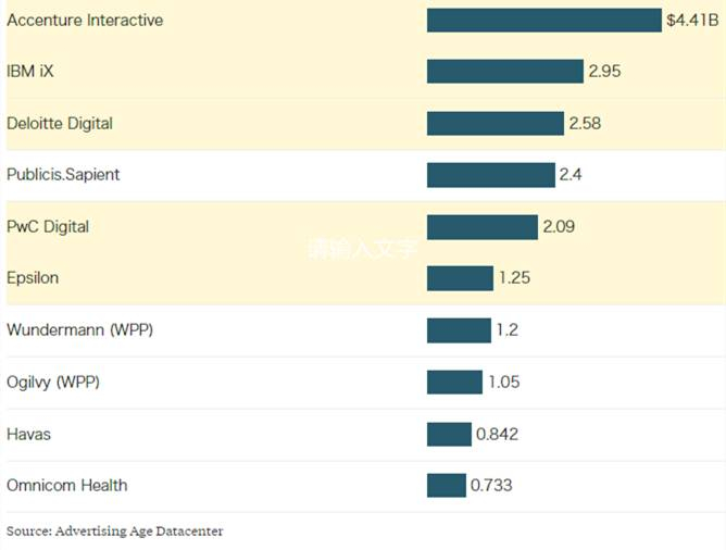 这样的业务规模已经相当可观。埃森哲互动(Accenture Interactive)共有1.8万名雇员,从收入看,它已是全球最大的数字广告公司,以及第六大的广告公司。