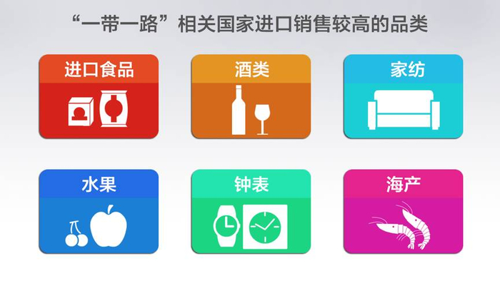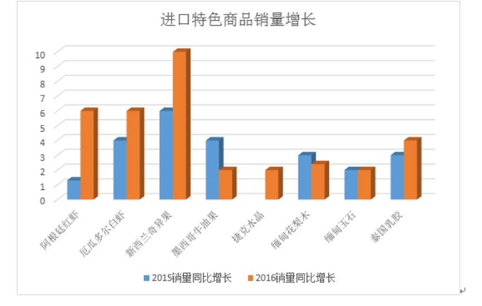 进口商品中,食品、酒类、家纺、水果、钟表、海产是“一带一路”相关国家进口销量最高的品类。作为2016年的水果明星,智利车厘子、墨西哥牛油果等在2016年走进了中国的千家万户。此外,阿根廷红虾、厄瓜多尔白虾等进口海产也走上了百姓餐桌,特别是各种节日期间,销量大幅上升。菲律宾7D芒果干、印尼进口果蔬干、丽芝士,越南进口LIPO面包干等食品也畅销全国,成为广受城市消费者喜爱的休闲零食。