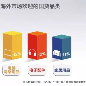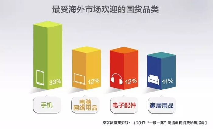 手机、电脑和网络产品、电子配件、家居用品是最受海外市场欢迎的中国商品。近两年,智能产品、汽车配件、运动户外、美容健康是海外销售占比增长最为亮眼的品类。从增速来看,2017年1月至4月,消费额同比去年增速最快的13个国家中,有7个“一带一路”沿线国家,消费额同比平均增速超过10倍。