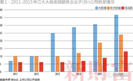 除了外部并购,大 智慧扩张的另一方式是开设子公司拓展新业务。大 智慧旗下子公司和联营企业的数量是几家上市的金融信息服务公司中增长最快的,增长速度最快的2013年实现了150%的增长,既包括了做化工贸易的深圳前海博盈石油化工投资有限公司,还包括了做视频直播的上海视吧传媒文化有限公司和视吧(深圳)网络科技有限责任公司(图1)。