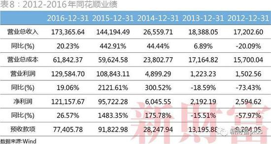 2016年同花顺的业营收实现了同比增长20.23%,除了因为前面提到的基金代销业务稳住了阵脚,还得益于在2015年市场好景时攒下了的巨额预收款项,这些款项逐步在2016年变现成收益计入财报中。扣除这部分款项,其业绩还是出现了一定程度的下滑(表8)。