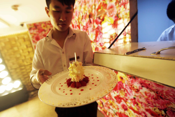 ▲服务员从厨房窗口端走一份冰淇凌甜点。