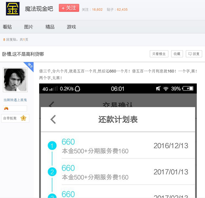 无独有偶,除了该网友质疑魔法现金逾期罚息太高,在相关贴吧上,还有网友质疑魔法现金高利贷。