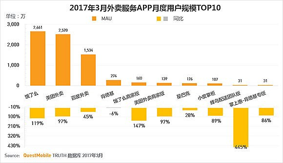 与吃紧的资金相匹配的是,百度外卖不断下滑的市场份额。从第三方咨询机构Quest Mobile统计的数据显示,在2017年第一季度,外卖服务用户规模达到6565万,同比增长率为74.9%。品质、品牌、卫生、送达时间等成为外卖服务APP关注的热点。