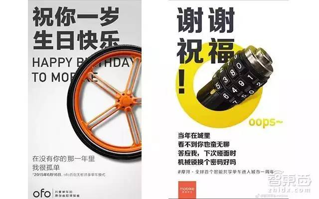 值得一提的是,在舆论帮助两者争夺老大位置之时,ofo与摩拜也上演了“温情”的一面。4月22日,摩拜单车迎来了进入城市一周年生日。当天,ofo官方放出了一张海报,祝对方生日快乐,并表示“没有你的那一年很孤独”。而摩拜官方也回复了一张海报向对方表示感谢,同时也回应称在城市中看不到ofo的时候也蛮无聊,并且还补了一刀,“下次再碰面时,机械锁换个密码好吗?”