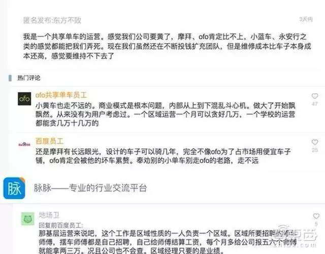 随后,又一个匿名为“东方不败”脉脉网友发文称是某共享单车的运营,觉得自己的公司前景不好,即将倒闭。一个“ofo共享单车员工”来安慰他说小黄车也走不远,因为内部管理混乱,区域运营与校园运营贪腐严重。