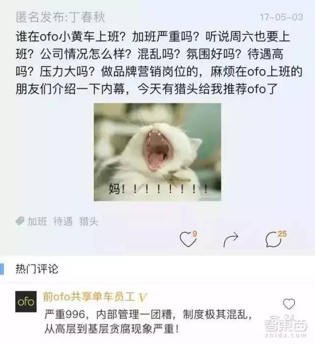 5月3日,一个匿名为丁春秋的网友在脉脉上提问,想要了解一下去ofo工作的前景,他问到了加班、氛围和待遇等问题。结果等来了“前ofo共享单车员工”的回答,“严重996,内部管理一团糟,制度极其混乱,从高层到基层贪腐现象严重!”