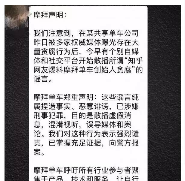 仔细看摩拜的三条声明,其潜台词很明确——在ofo被曝出贪腐现象之后,有同行故意诬陷摩拜。