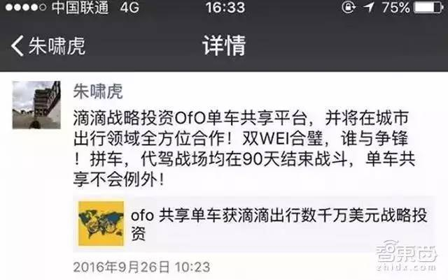 2016年9月26日,在ofo宣布获得滴滴数千万元战略投资之后,ofo与滴滴的投资方——金沙江创投的创始总经理朱啸虎发了一条朋友圈,称共享单车领域的战场将在90天内结束战斗!