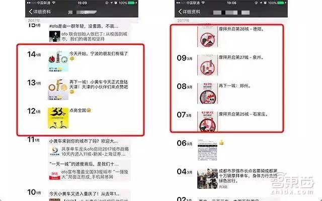 (配图为ofo与摩拜高管的朋友圈,可见其在连续宣传进入新的城市)