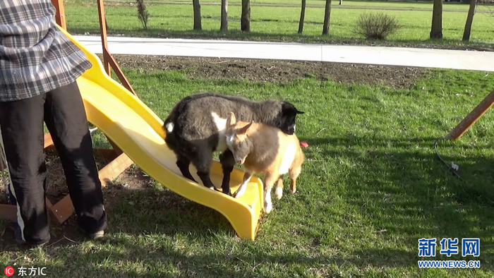2017年5月18日,这两只小山羊在滑梯上玩的不亦乐乎,它们争着抢着要先到滑梯上面去。两只山羊的主人名叫David,来自美国俄亥俄州,今年38岁。当时他两岁的儿子正在院子里玩,家里的两只小山羊跑来凑热闹,David用相机记录下这搞笑的一幕。(图片来源:东方IC)