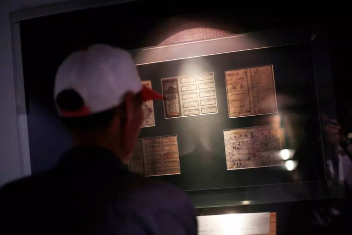 ▲ 一名观众驻足观看革命根据地、解放区证券。