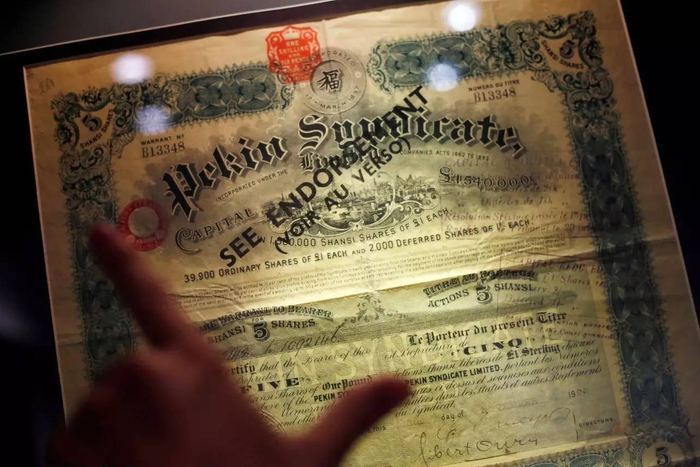 ▲ 山西商办全省保晋矿物总公司使用的股票息折。1905年,英国人侵夺山西矿产,晋人掀起赎矿运动,夺回了开矿权。