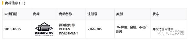 “得闲投资”的商标正在注册中,而申请注册方是得闲影业(北京)有限公司(以下简称“得闲影业”)。得闲影业正是《欢乐颂2》出品方正午阳光的全资子公司,法定代表人是该剧的制片人侯鸿亮。得闲影业2016年2月成立,是不久前热播的正午阳光另一部电视剧《外科风云》的联合出品方。