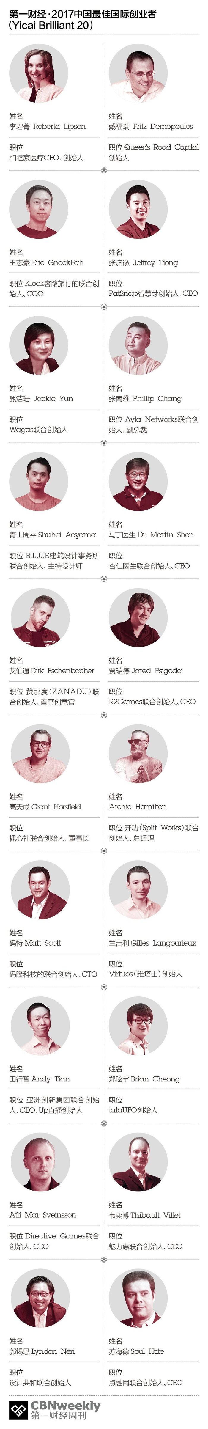 通过第一财经全媒体旗下各新媒体及经典媒体,可以获取“中国最佳国际创业者”(Yicai Brilliant 20 )的完整榜单及分析、文字特写、视频专访: