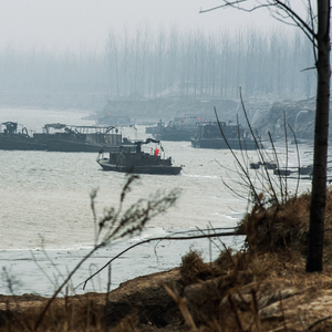 黄河波澜不惊,几艘大型采砂船静静停泊。一场涉及采砂企业的强拆正在岸边进行,这些采砂企业的船只、采砂设备及建筑物将被强行拆除。