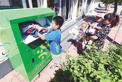 河北廊坊大厂回族自治县大厂四村,小朋友将废旧衣物放进回收箱。