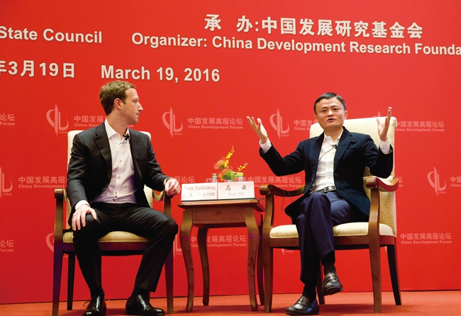 2016年3月19日,中国发展高层论坛上,马云和Facebook创始人兼首席执行官扎克伯格对话