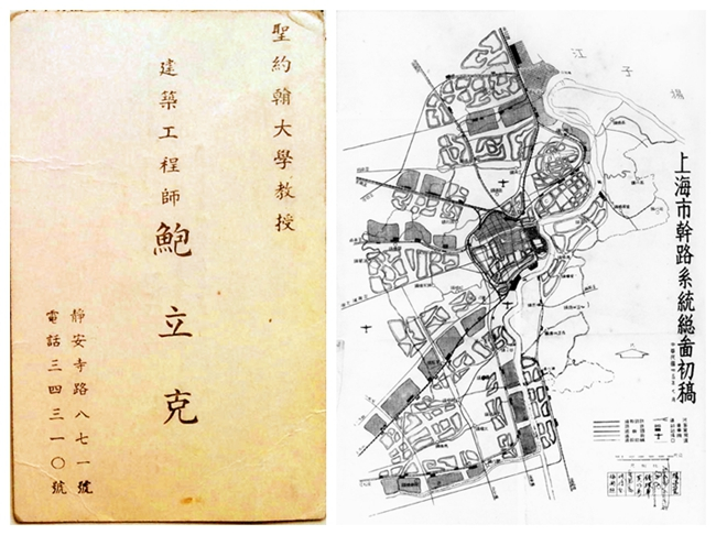 鲍立克早期印制的圣约翰大学教授名片(左),以及“大上海都市计划”初稿之一