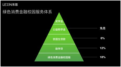 未来,在校园金融服务方面,乐信将联合银行等金融机构推五个层次的产品,从年化18%的校园版绿色消费金融到6%的贫困生贷款,以及免息的公益助学金、优秀学生奖学金等产品,都会覆盖。