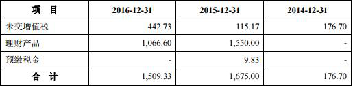 公司表示,2015 年末、2016 年末,其他流动资产余额较大,主要系 2015 年末、2016年末公司利用闲置资金购买理财产品余额 1,550 万元、1,066.60 万元计入其他流动资产所致。