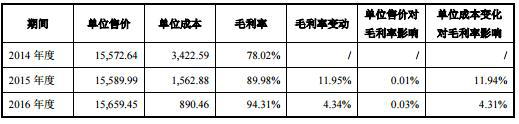 据寿仙谷招股书显示,公司核心产品为灵芝孢子粉,2014年至2016年该产品毛利率分别为78.02%、89.98%、94.31%;单位售价分别为15,572.64元、15,589.99元、15,659.45元;单位成本分别为3,422.59元、1,562.88元、890.46元。