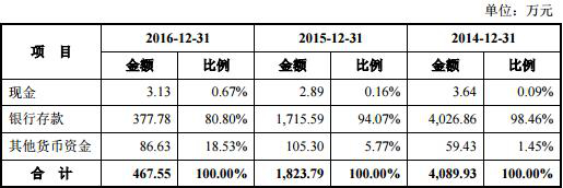 据寿仙谷招股书显示,公司2014年至2016年货币资金总额分别为4,089.93万元、1,823.79万元、467.55万元;占资产总额的比重分别为 8.16%、3.01%和 0.76%。