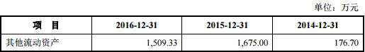 寿仙谷2014年至2016年其他流动资产余额分别为176.70万元、1,675.00万元、1,509.33万元。