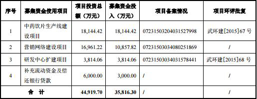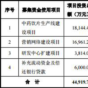1.中药饮片生产线建设项目,项目投资总额18,144.42万元,募集资金投入18,144.42万元;2.营销网络建设项目,项目投资总额16,961.22万元,募集资金投入10,857.82万元;3.研发中心扩建项目,项目投资总额3,814.06万元,募集资金投入3,814.06万元;4.补充流动资金及偿还银行贷款,项目投资总额6,000.00万元,募集资金投入3,000.00万元。