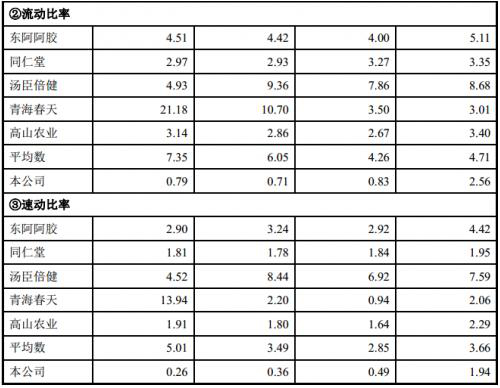 报告期内,可比公司的流动比率平均值分别为4.71、4.26、6.05、7.35,速动比率平均值分别为3.66、2.85、3.49、5.01。由下表可知,寿仙谷的这两组数据整体上远远弱于同行业可比公司,反映出寿仙谷的偿债能力不及行业平均水平。一般说来,流动比率越高,说明企业资产的变现能力越强,短期偿债能力亦越强,反之则弱;而对于速动比率过低的企业来说,其短期偿债风险则较大。
