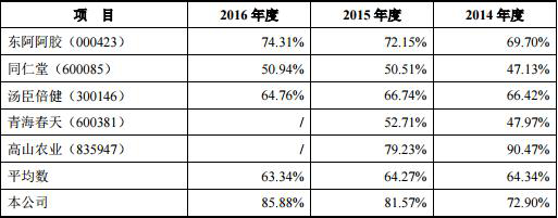 据寿仙谷招股书数据显示,公司2014年至2016年毛利率分别为72.90%、81.57%、85.88%。同行业可比上市公司分别为东阿阿胶、同仁堂、汤臣倍健、青海春天、高山农业。