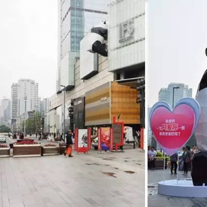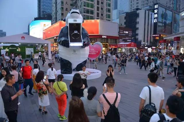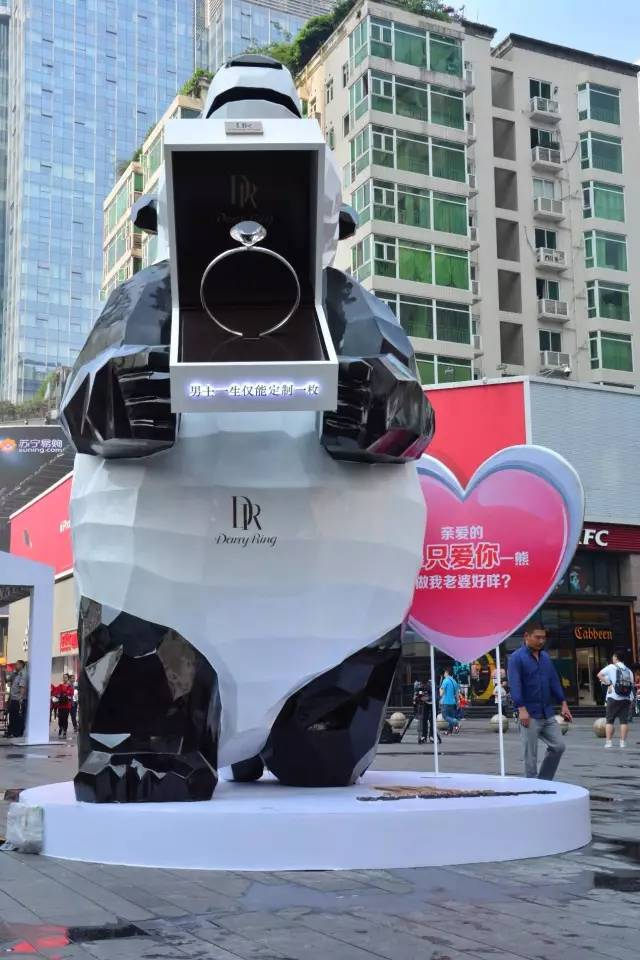 在成都最繁华的商业街春熙路步行街口,一只大熊猫拿着一枚巨大的DR钻戒,单膝下跪45°仰望向趴在墙上著名的成都IFS网红熊猫,求!婚!了!