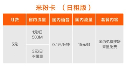 米粉卡日租版目前为用户提供两档套餐选择,分别为1元日租卡和3元日租卡。两种资费套餐月费均为5元,当日使用流量则默认开通日租套餐,不使用流量则不扣费,国内流量按照15元/GB计收(用户不使用省外流量不扣费)。需要说明的是,15元/GB的国内流量计费方式是指不足150MB按实际用量0.1元/MB收费,达到15元,150MB~1GB免费使用,以此类推。