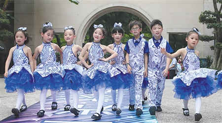 轮胎秀的展示还得配合创意表演。一年级3班的展示主题是“青花瓷”,孩子们在团扇上绘制青花图案,上演了一场美轮美奂的舞蹈表演;二年级2班则将世界各大洲的服装和舞蹈搬上了舞台;三年级1班的孩子们带来一场海洋小动物与大鲨鱼斗智斗勇的舞台剧。